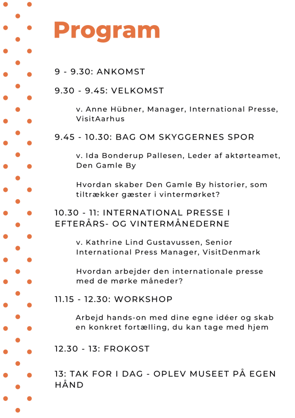 Vi inviterer dig til en inspirerende formiddag i Den Gamle By, hvor du får både inspiration, konkrete værktøjer og mulighed for at udvikle dine egne historier, der kan skabe interesse hos den internationale presse i efterårs- og vintermånederne.